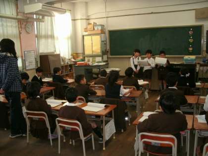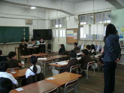 1年2組は、音読発表会をしていました。班ごとに前に出て大きな声で音読をしていました。毎日宿題で音読を続けているので、とても上手に発表していました。