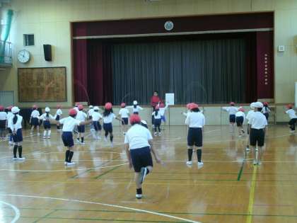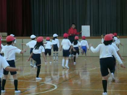 2年生は、体育館でなわとびをしていました。曲に合わせて、前まわしとびや後ろ回しとび、駆け足とびなどをしていました。
