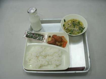 今日の給食は、酢豚、中華スープ、焼きのり、ごはん、牛乳です。