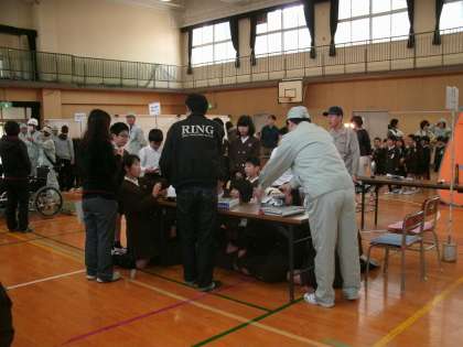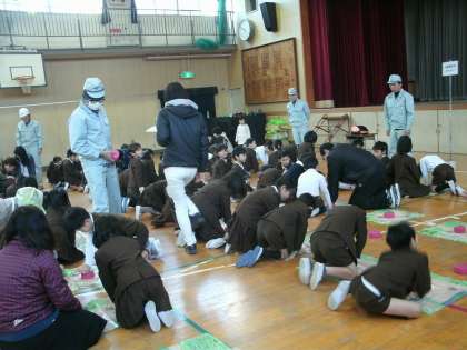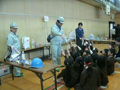 2時間目は、防災コーナー巡りをしました。港区にある会社「リング」さんと地域活動協議会から様々な防災用品をお借りし、体験させていただきました。磯路の自主防災組織いそっぷの方々や各町会の防災リーダーの方々がわかりやすく指導してくださいました。