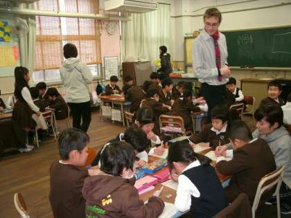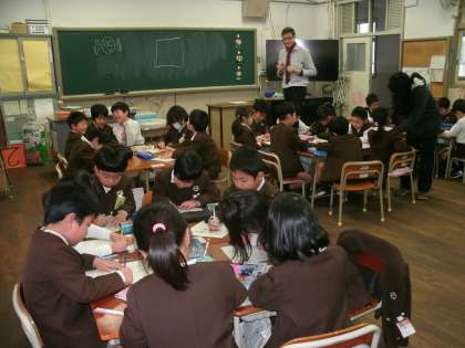 1年生は、1組・2組合同で外国語活動をしていました。「ワン・ツー・スリー…」という元気な声が響いていました。
