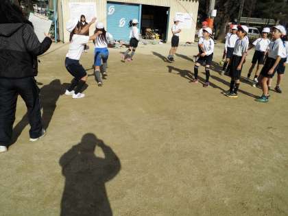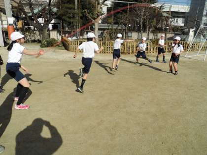 5年生は、運動場で体育の学習をしていました。長なわで連続8の字とびの練習をしていました。
