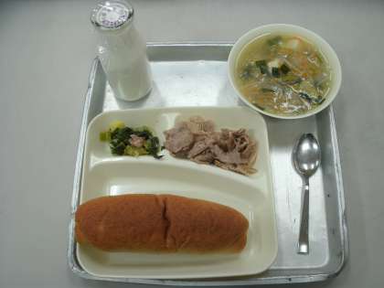 今日の給食は、豚肉のオイスターソース焼き、糸寒天のスープ、ピリ辛あえ、ライ麦パン、牛乳です。