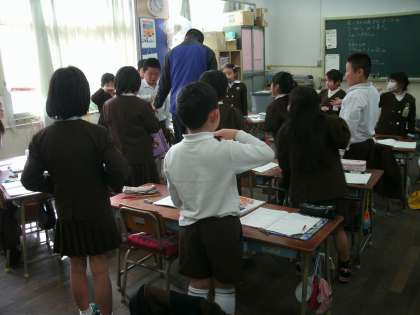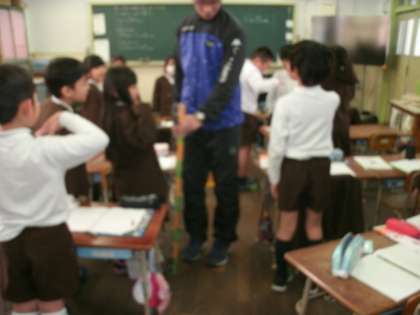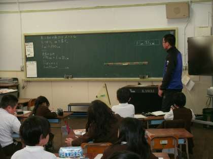2年1組は、算数の学習をしていました。「長いものの長さの単位」について調べていました。1mが自分の身長から考えてどのくらいのところか予想していました。