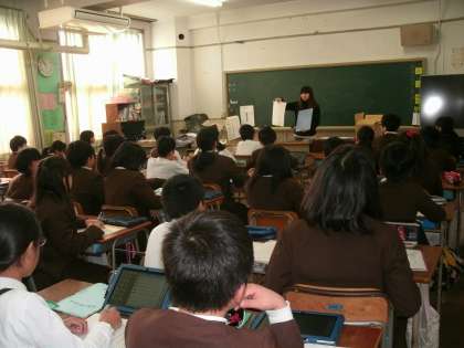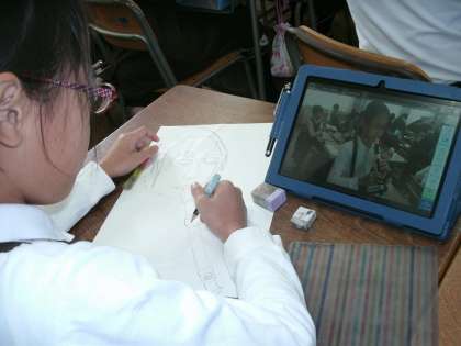 5年生は、図画工作の学習をしていました。リコーダーを吹く自分の映像をタブレットの画面でみながら、版画の下絵を描いていました。