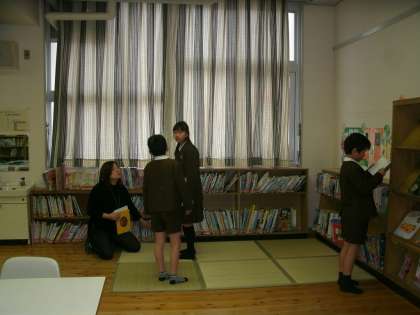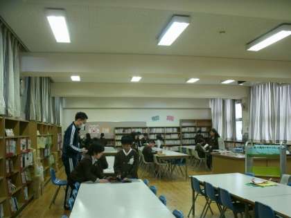 4年1組は、図書室で読書をスタートするところでした。毎週木曜日には図書館支援員さんが終日在室しています。新しく入った本について児童が質問していました。