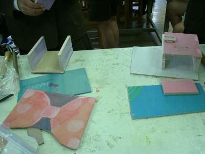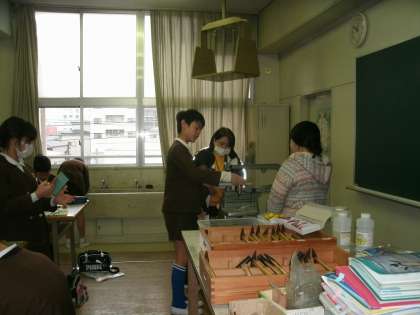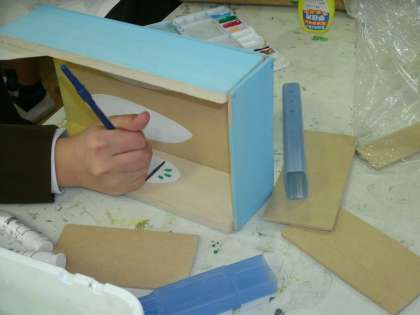 6年生は、図工室で図画工作の学習をしていました。木工作をしています。電気のこぎりで板を切り、きれいに色をぬって作品を仕上げていました。
