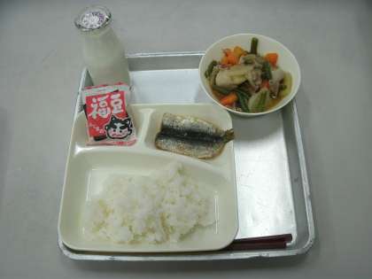 今日の給食は、いわしのしょうがじょうゆかけ、含め煮、いり大豆、ごはん、牛乳です。節分の行事献立です。