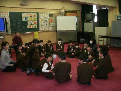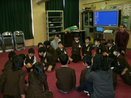 1年2組は、多目的室で外国語活動をしていました。音楽が流れている間、ボールをまわします。ボールがまわってきたら英語でフルーツの名前を言います。