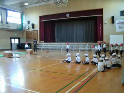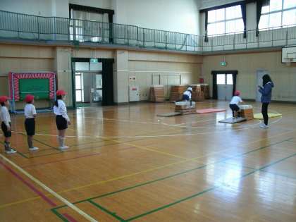 1年生は、体育館で体育をしていました。跳び箱で開脚とびをしていました。