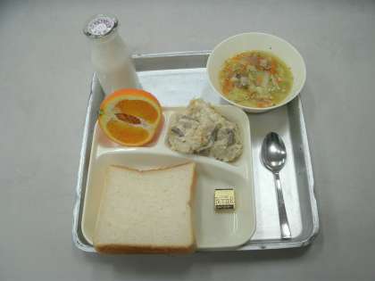 今日の給食は、押し麦のグラタン、スープ、いよかん、食パン、バター、牛乳です。