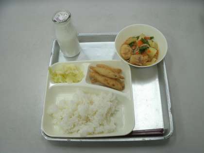 今日の給食は、わかさぎフライ、一口がんもとじゃがいもの煮物、あっさりキャベツ、ごはん、牛乳です。