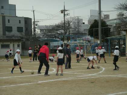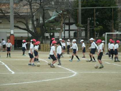 2年生は、運動場で体育をしていました。ボールを使って蹴る運動をしていました。
