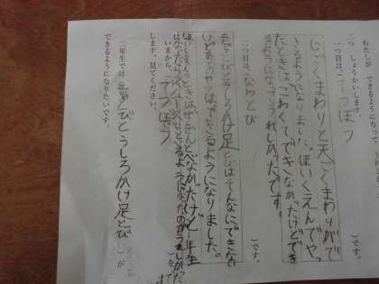 1年は来週の参観の時間に、入学してからできるようになってうれしかったことを一人ひとり発表します。今日は、そのために練習をしました。発表することを書いたプリントを先生に見てもらったり、お友達に発表内容を聞いてもらったりしていました。多くの人の前で発表することは、緊張すると思いますが、頑張って乗り越えてほしいと思います。
