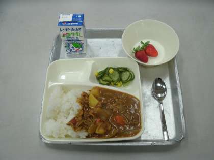 今日の給食は、ポークカレーライス、きゅうりとコーンのサラダ、いちご、牛乳です。