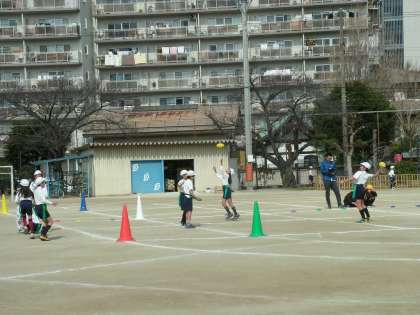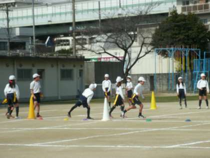 4年生は、運動場で体育の学習をしていました。班に分かれてタグラグビーをしていました。