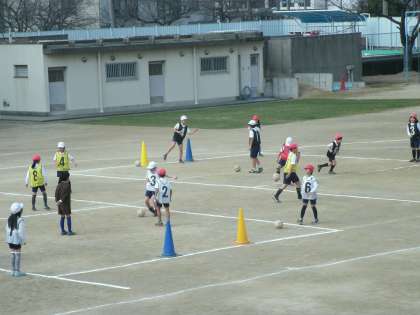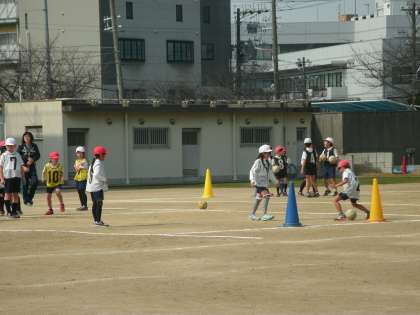 3年生は、運動場で体育を学習中でした。グループに分かれてサッカーをしています。
