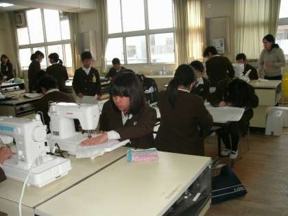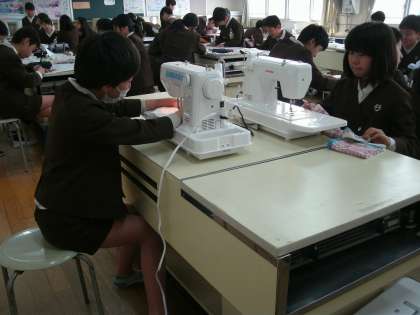 6年生は、家庭科室で在校生にプレゼントするぞうきんを作っていました。
