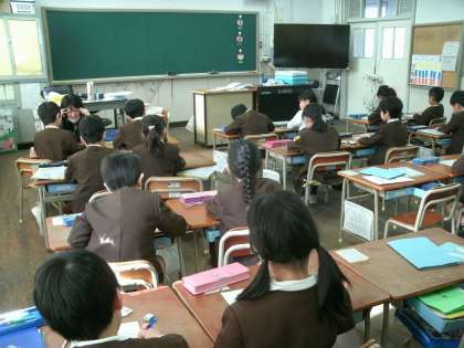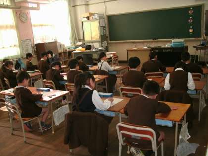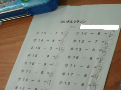 1年2組は、算数の学習をしていました。「計算マラソン」のプリントの答え合わせをしていました。「やったー。100点満点。」と喜ぶ声が、たくさん響いていました。