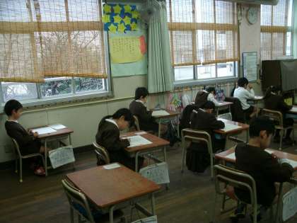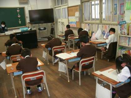 1年2組は、国語のテストをしていました。みんな真剣な表情で集中して問題を解いていました。