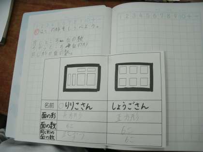 2年1組は、算数の学習をしていました。直方体と立方体の面の形の同じところ、違うところに注目し、はこの形を調べていました。