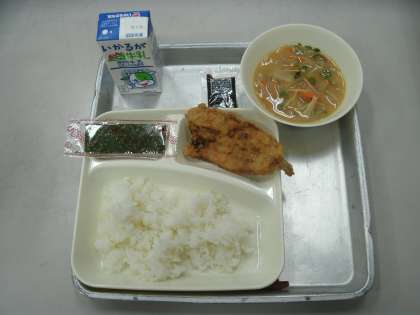 今日の給食は、いわしのフライ、みそ汁、焼きのり、ごはん、牛乳です。