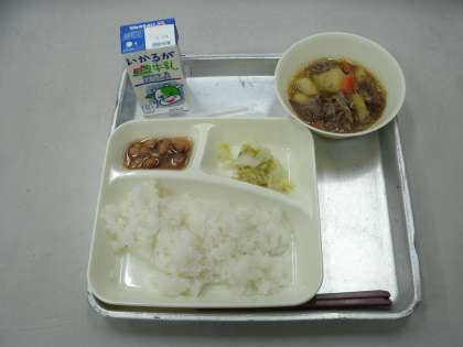今日の給食は、肉じゃが、はくさいの甘酢づけ、とら豆の煮もの、ごはん、牛乳です。