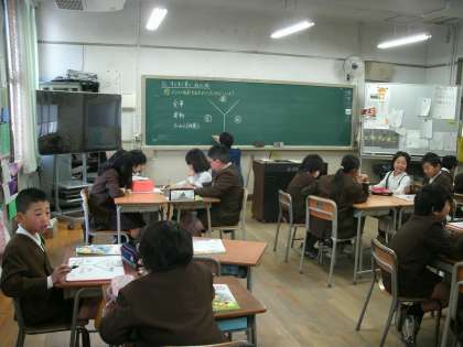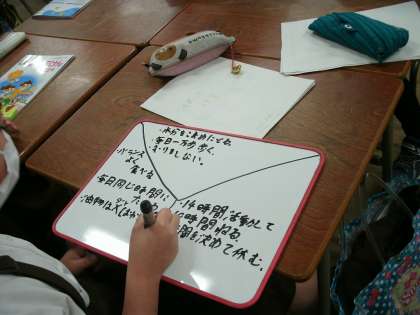 4年1組は、保健体育の学習をしていました。「すくすく育て私の体」の学習では、食事・運動・睡眠(休養)の3つの観点から、より良く成長するために大切なことは何か班で考えていました。