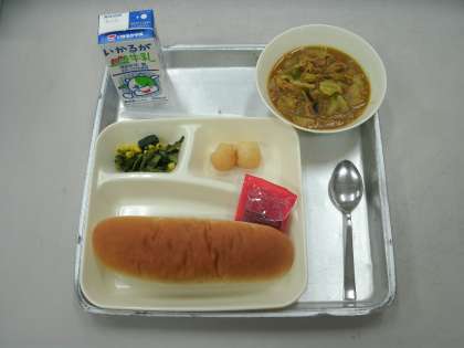 今日の給食は、豚肉と野菜のカレー煮、ほうれん草のソテー、あげポテトもち、コッペパン、いちごジャム、牛乳です。