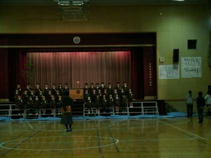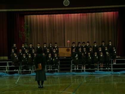 1年生は、入学式で行う、新1年生のお迎え式の練習をしていました。大きな声の呼びかけが、講堂に響いていました。