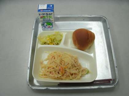 今日の給食は、さけのクリームスパゲッティ、キャベツとコーンのサラダ、黒糖クレセントロールパン、牛乳です。