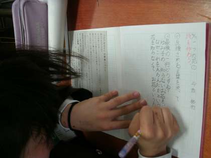 6年生は、国語の学習をしていました。「一つの花」の学習のふり返りを、ノートに書いているところでした。