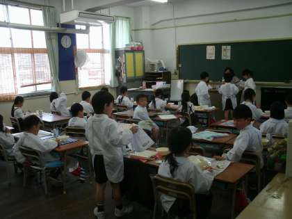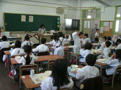 1年1組の給食の様子です。食べ終わった人は、静かにぬり絵をしています。