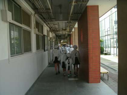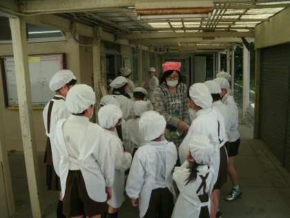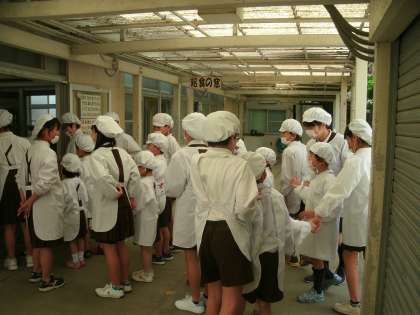 1年生の給食の運搬を6年生が手伝います。給食室まで、6年生が1年生の手をつないで一緒に来ます。整列の仕方を教えています。