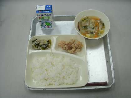 今日の給食は、鶏肉のからあげ、中華スープ、チンゲンサイともやしの甘酢あえ、ごはん、牛乳です。