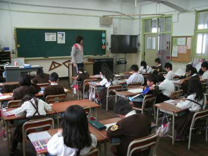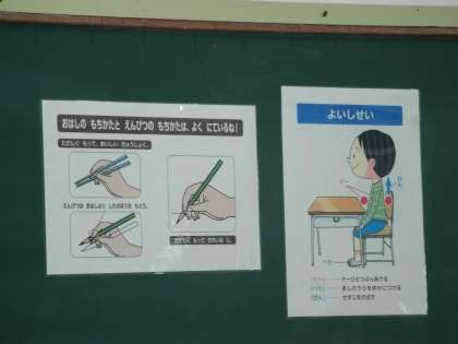 1年1組は、良い姿勢について担任の先生から教えてもらい、自分の姿勢を確認していました。背筋は「ピン」、足は床に「ペタ」、おなかと机の間は握りこぶしひとつ分「グー」。いつも良い姿勢を意識しましょう。
