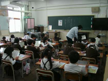 1年2組は、ひらがなの練習帳を開いていました。「ひらがなのひょう」をみていました。練習をしっかりとがんばって、ひらがなをきれいに書けるようになりましょう。