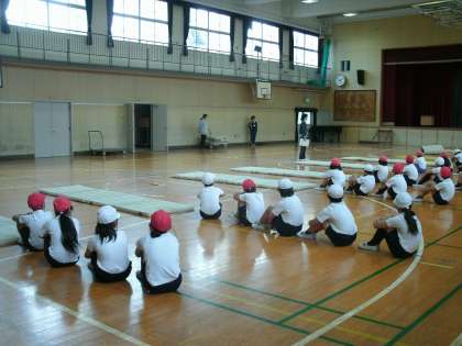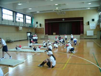 4年生は、体育館でマット運動の学習をしていました。体ならしのゆりかご運動をしているところでした。