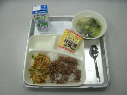 今日の給食は、ビビンバ、トック、いり黒豆、牛乳です。
