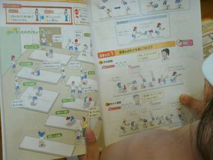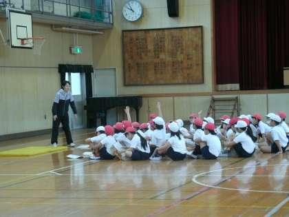 4年生は、体育の学習をしていました。マット運動を始めるところでした。開脚前転のポイントを確認していました。