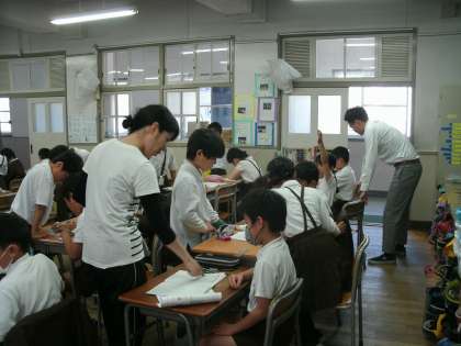 「けが調べ」の一覧を見ながら、けがの種類とけがをした場所ごとの人数を整理してわかりやすく表していました。早く作業が終了した人は、まだの人の席へ助けに行っていました。