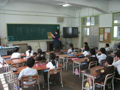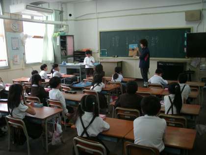 1年2組は、担任の先生による絵本の読み聞かせを聴いていました。学級文庫にある「あな」という絵本の読み聞かせでした。