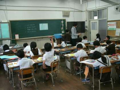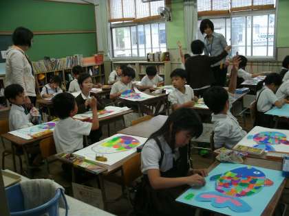 2年1組は、図画工作の学習をしていました。画用紙一面に大きく描いたきれいな魚を仕上げていました。