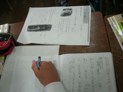 5年2組は、国語の学習をしていました。「わにのおじいさんのたから物」の結末を予想しながら読み取っていました。どんな結末になるのか、自分の予想した結末をノートに書いていました。