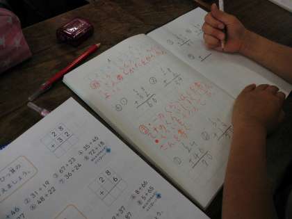 2年は算数で足し算の筆算を学習しています。ノートにていねいに筆算をかくことができていました。けたをそろえることや、筆算のときに描く直線はものさしを使うなど教えてもらいました。ていねいに取り組み確実に身につけてほしいと思います。