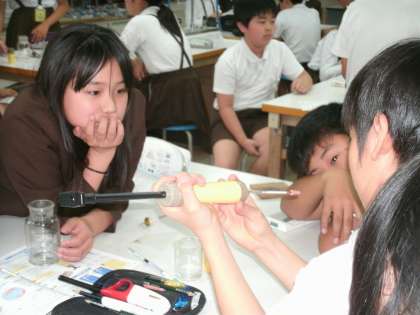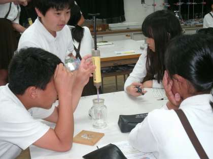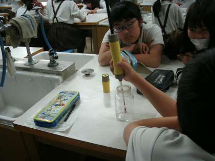 気体検知管を使って、酸素と二酸化炭素の割合を調べているところです。