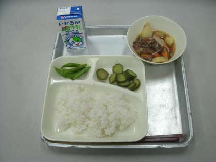 今日の給食は、肉じゃが、きゅうりのかつお梅風味、枝豆、ごはん、牛乳です。