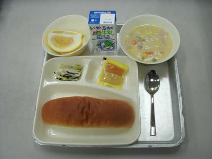 今日の給食は、コーンクリームシチュー、キャベツのひじきドレッシング、河内ばんかん、コッペパン、牛乳です。