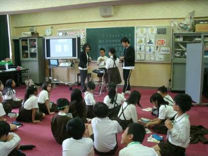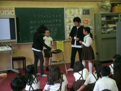 5年2組は、多目的室で外国語活動をしていました。数字のカードを使ったゲームをしていました。