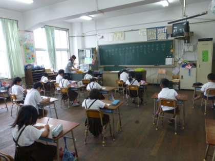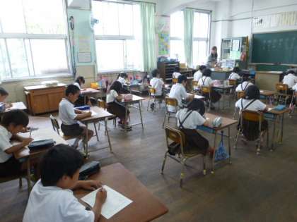 6月4日(水)今日は、曇り空です。お昼からは雨になるようです。2年生は、国語の時間に漢字テストに取り組んでいました。